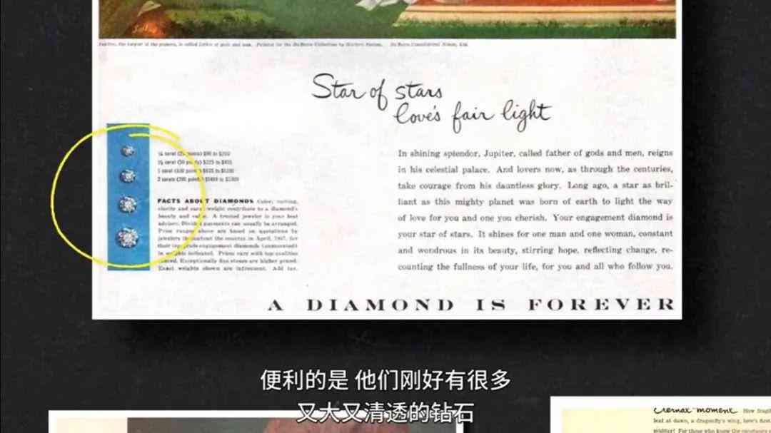通过铺天盖地的广告宣传,一句“钻石恒久远,一颗永流传”,让无数女人为之倾倒,钻石文化从此深入人心。
