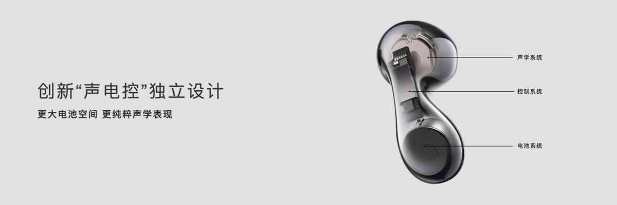 传统TWS耳机常常将发声单元、电池单元和控制电路板集中堆叠在“耳包”部分,导致电池和发声单元的模组变得非常紧凑,降低了器件性能。为了解决这个问题,工程师采用了“声电控”三分离设计来优化华为FreeBuds 5的内部器件布局,将发声单元模组单独放置在耳包中,电池模组放置在耳柄中,控制电路板放置在起到衔接作用的耳杆中。这种设计方案充分利用了各个器件模组的空间,从而在听觉体验方面提供更好的音质表现,并消除了电流噪音的影响。