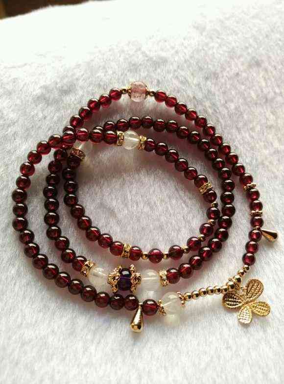 (4)晶体通透度:晶体越通透价格越高,好的石榴石手链在单一光源的照射下整个晶体通透发光,就像一个圆润饱满的石榴籽一样,惹人喜爱。而差一点的石榴石或者是人造石榴石则不会有那么好的效果。
