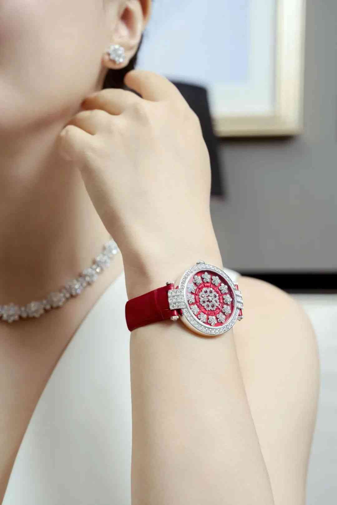 白18K金表壳直径36mm,上手大小正适合。颜色纯正的红色珍珠母贝表盘,搭配钻石向阳花时标,呈现独特的三维立体效果,加上表圈和表耳的美钻,比一般的钻表更显重磅。