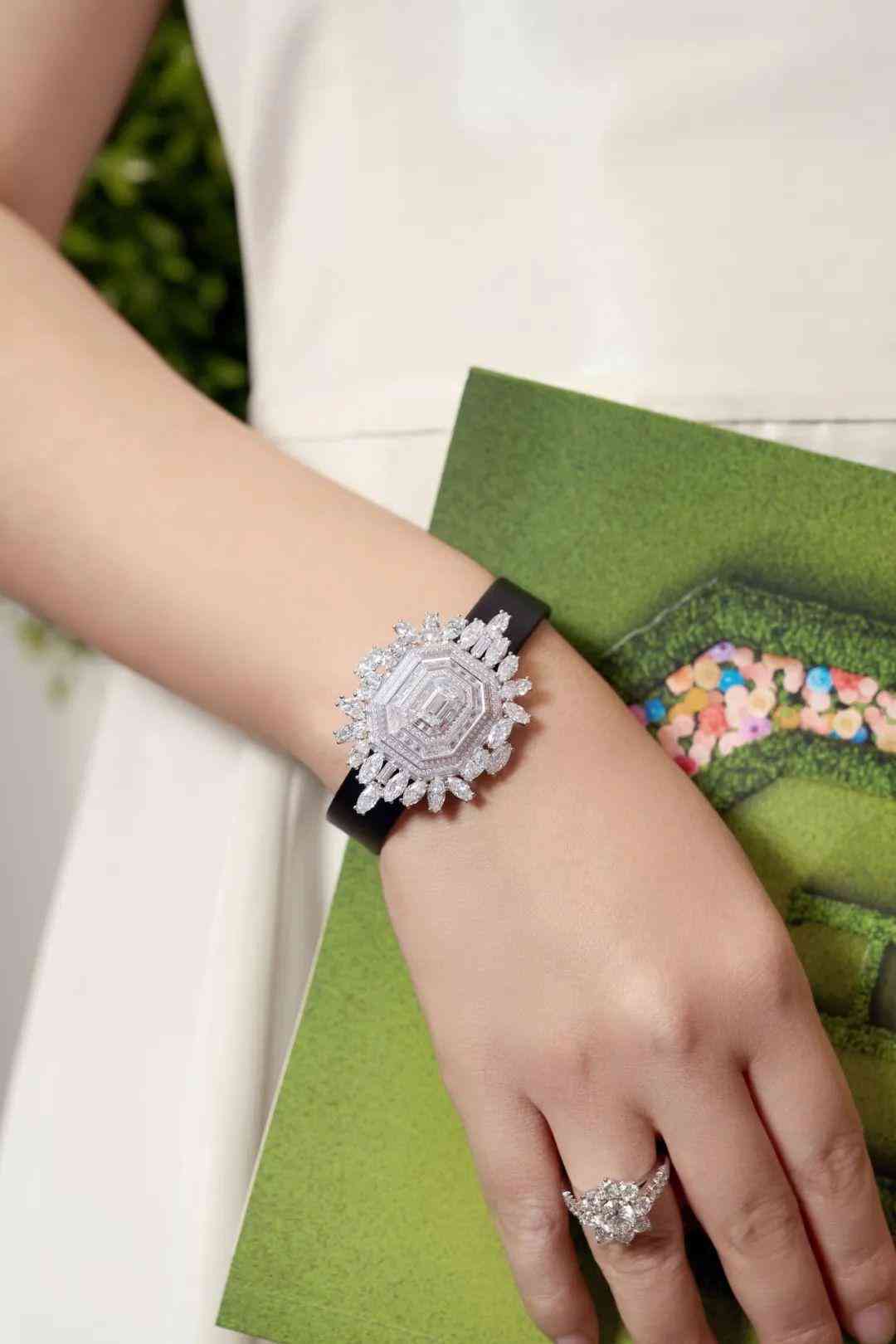 腕表的外观堪称独一无二,由许多长方形台面和祖母绿型的几何造型组成,打造出“镜厅”一般的反射效果。整个腕表上镶嵌的圆形、长形、马眼型、祖母绿型切工钻石,总重近10克拉,举手投足间流光溢彩、火光四射,让人移不开眼睛。