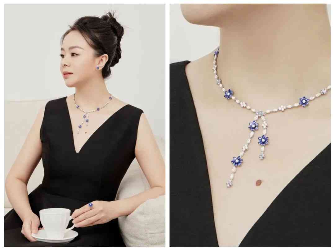 项链镶嵌着78颗水滴形和圆形明亮式切工,总重约9.37克拉的蓝宝石,以及99颗榄尖形和圆形明亮式切工,总重约8.61克拉的钻石,足够华丽的同时又纤巧灵动,举手投足间不经意流露女人味。