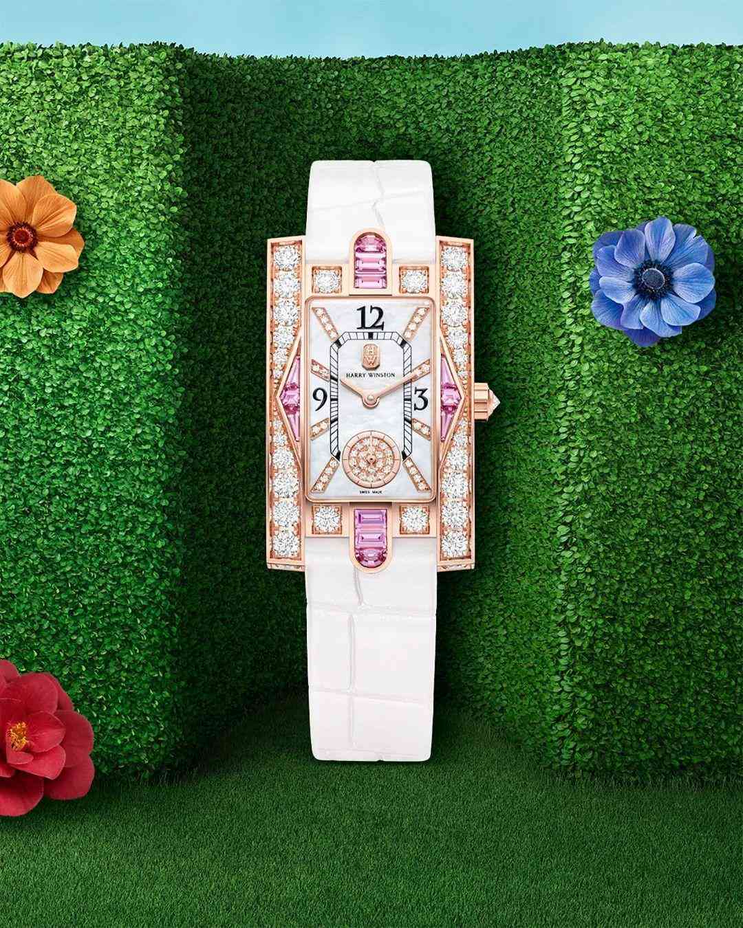 18K玫瑰金方形表壳十分独特,镶嵌璀璨美钻和粉色蓝宝石,致敬了装饰艺术时期,还融入品牌纽约旗舰店的标志性元素,很有HW经典基因。