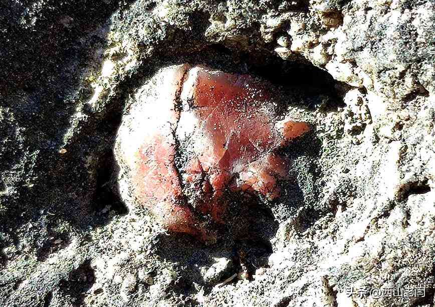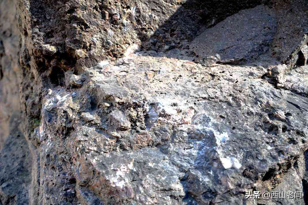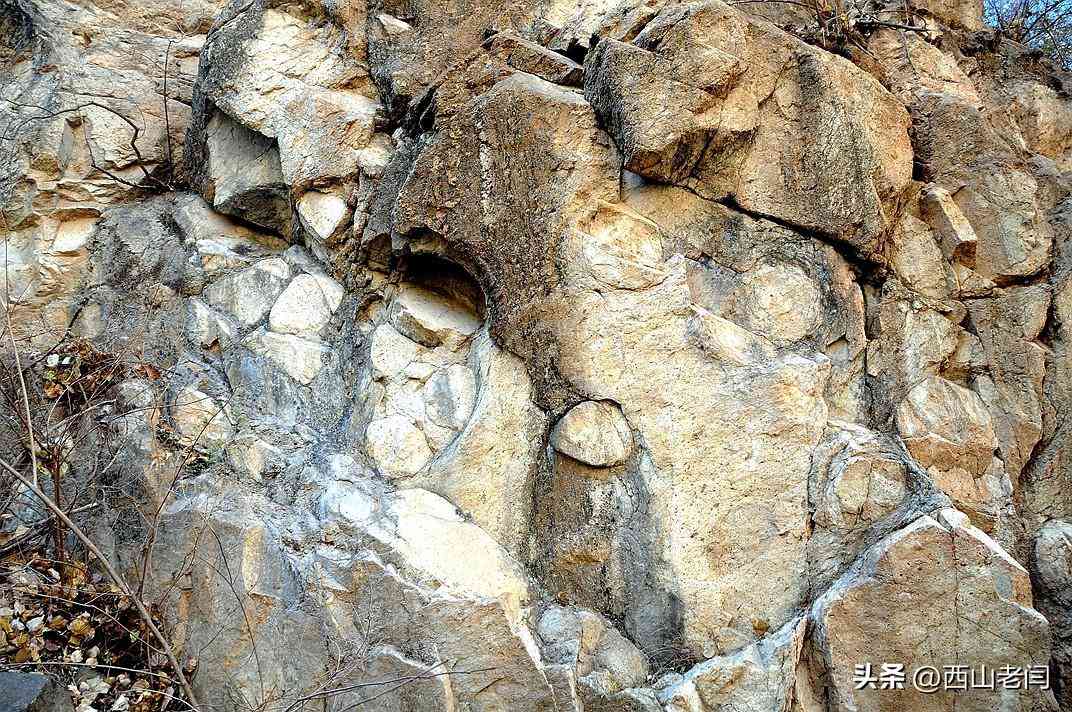 按照标牌介绍所说在岩石上细看,岩石中的确夹杂着玛瑙石。一般人是不会那么细致地观察,这便是行家和外行的区别。
