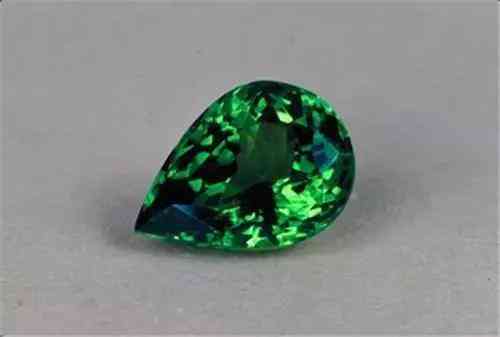 沙弗莱石的宝石学名称为铬钒钙铝榴石,因含有微量的铬和钒元素,娇艳翠绿,赏心悦目。沙弗莱石在颜色上呈黄绿色至亮绿色,表面光泽强于祖母绿,密度也比祖母绿要高。并且,沙弗莱石的内部无祖母绿中常出现的三相或两相包体,沙弗莱石中常见的是固体包体或负晶。
