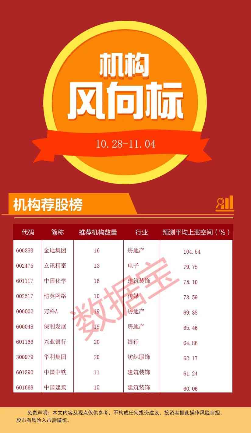 数据宝统计,在获10次及以上机构评级的234股中,10股上涨潜力超过60%,其中金地集团上涨潜力为104.54%居于首位。行业分布上来看,机构看好多只地产和建筑板块个股,包括金地集团、万科A、中国中铁、中国建筑,价较机构一致目标价均有60%以上的上涨空间。