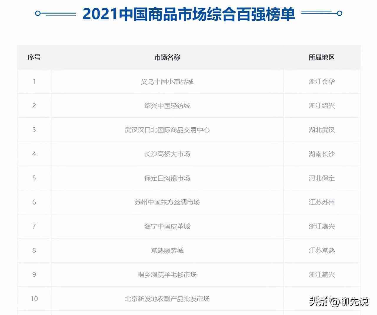 保定白沟镇市场排在榜单第5位,由最初的地摊市场,建成具有和道国际箱包城、和道国际原辅料城、国际商贸城、服装城、五金机电建材城等十余个专业化的大型商贸集群,年市场成交额超过1200亿元,其中当地的箱包城是全球最大的箱包批发市场;排在第4的是长沙高桥大市场,经营商贸流通企业近万家,经营从业人员超过20万,经营商品种类超过170万种,年人流量超过5亿人次,年交易额达到1620亿元。拥有酒水食品城、酒店用品城、茶叶茶具城等八个大型专业市场和中非经贸合作促进创新示范园、出口产品集聚区等进出口平台。