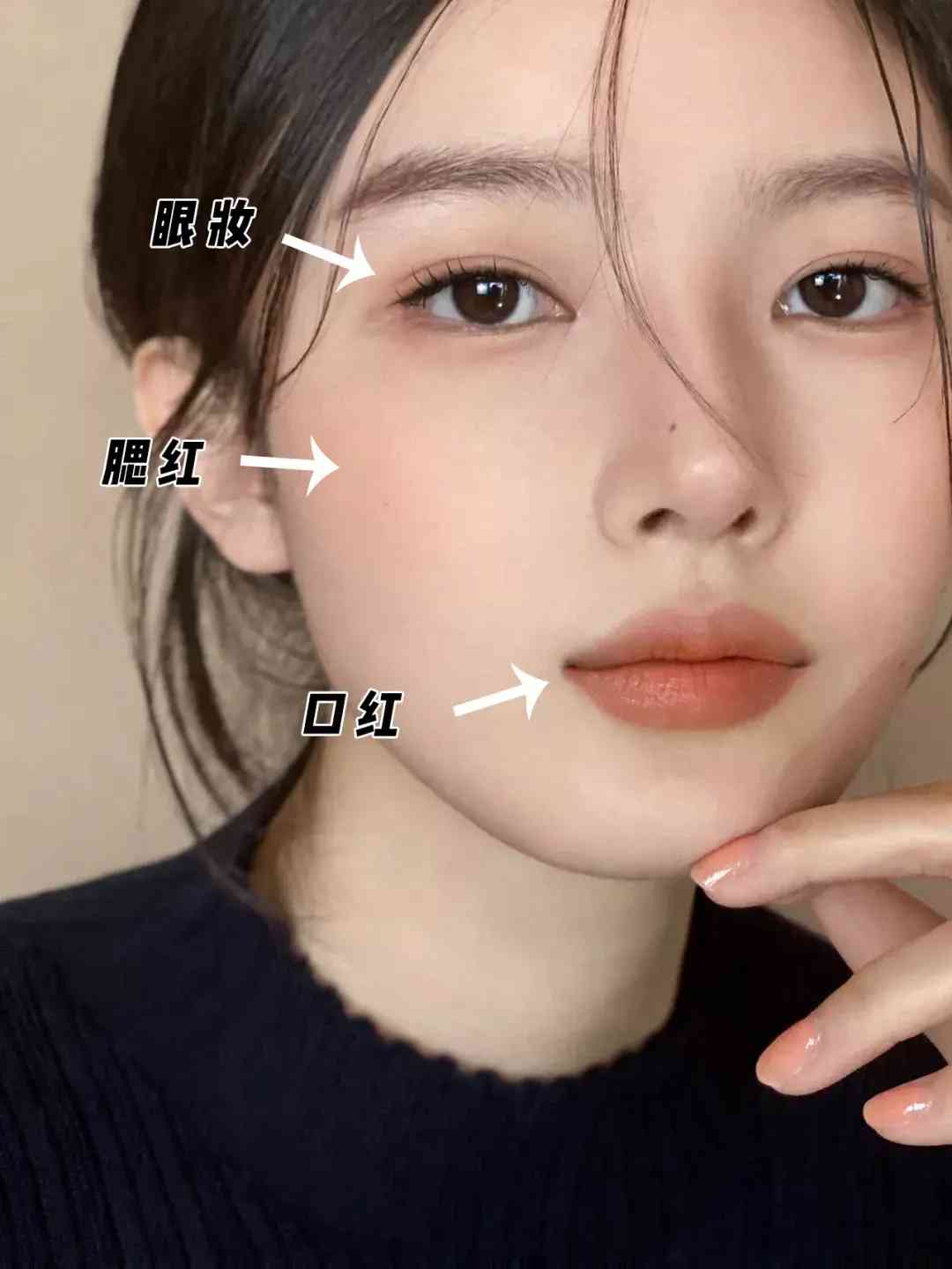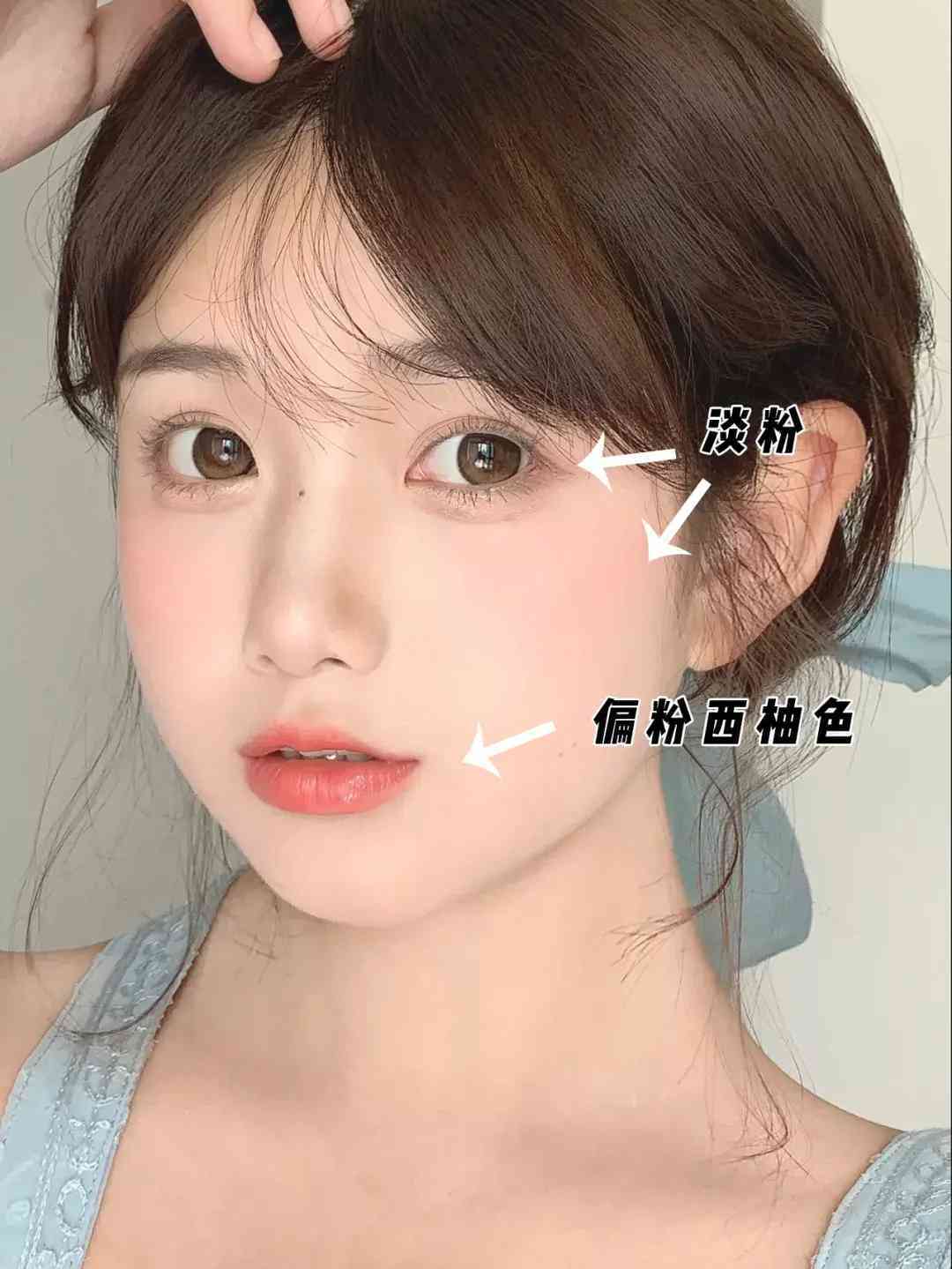 也是和上面一样的同色系配色,眼妆、腮红和口红都用的偏粉的豆沙色,口红的饱和度可以高一些。