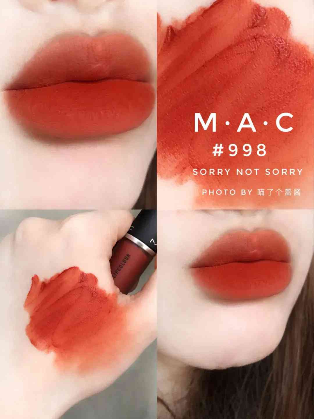 MAC #998:很活泼的胡萝卜色,带一点点橘棕调,饱和度特别高,夏天涂很亮眼,最好是带妆哦~