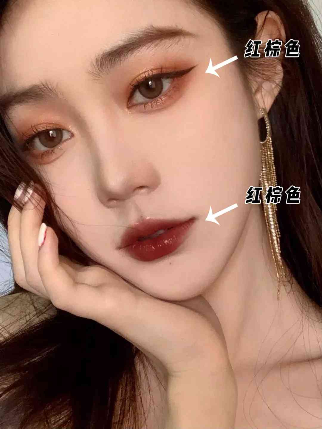 你今天涂了红棕色的眼影,那杏色和玫瑰色腮红是不是感觉都挺配的?