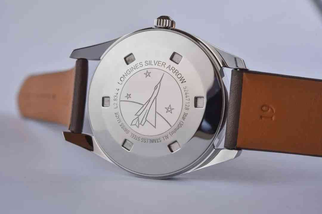 尽管浪琴10年前就已推出银箭复刻版,但2021版本才是普遍认为最忠于原版的设计。简约大三针、38.5毫米表径、整个银白色表盘除了品牌名、logo和Silver Arrow字样外,不再有任何冗余信息。Silver Arrow采用商务手写字体,在奢侈品牌纷纷将logo改成清一色非衬线字体的当下,反倒衬得清丽动人。带有凹槽的小时刻度和表背上的超音速飞船也完整参照原作,颇具其诞生时期流行的未来主义风范。