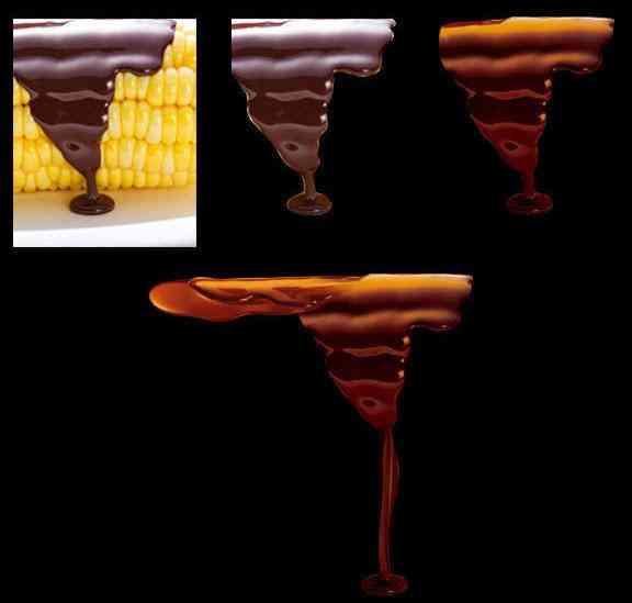 7、把抠图出来的巧克力,适当放到文字上,进行调色,变形,拉伸,尽量做到往下顺流的感觉。