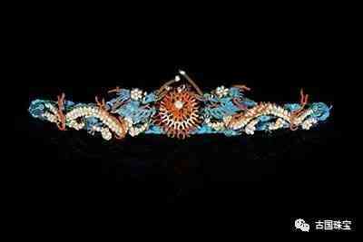 银镀金点翠嵌珠双龙纹长簪。清朝,材质:鎏金有色银、玻璃珠、珊瑚与珍珠。北京故宫博物院藏品。云彩背景之上,表现双龙戏珠纹样。这枚大发簪以绘画与细节描绘出一场欢腾的游戏场面:珍珠装饰的火焰从龙口中喷出,在中央形成一个火球。