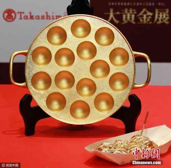 资料图:2016年,日本大阪,高岛屋百货公司举办黄金展,图为价值4320万日元的黄金锅在制作章鱼烧。图片来源:视觉中国