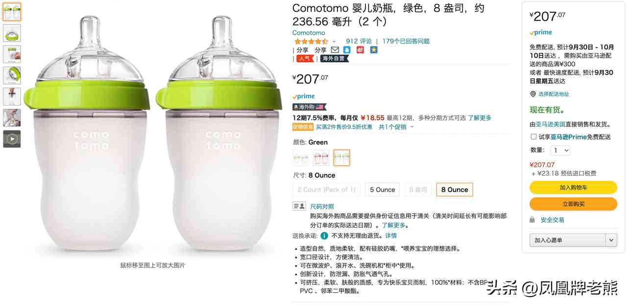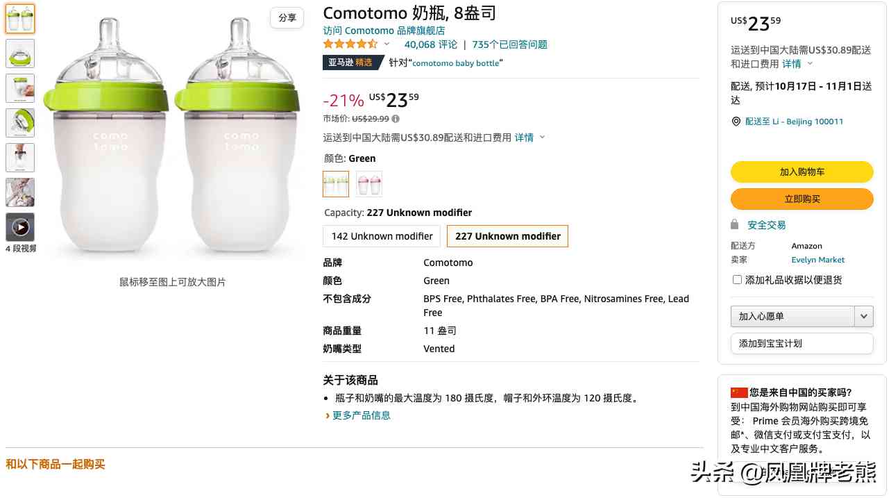 大熊通过“亚马逊海外购”,购买了一对“Comotomo婴儿奶瓶”。 这对奶瓶由“亚马逊美国”自营店供货的产品。亚马逊美国将安排快递将奶瓶快递给大熊。