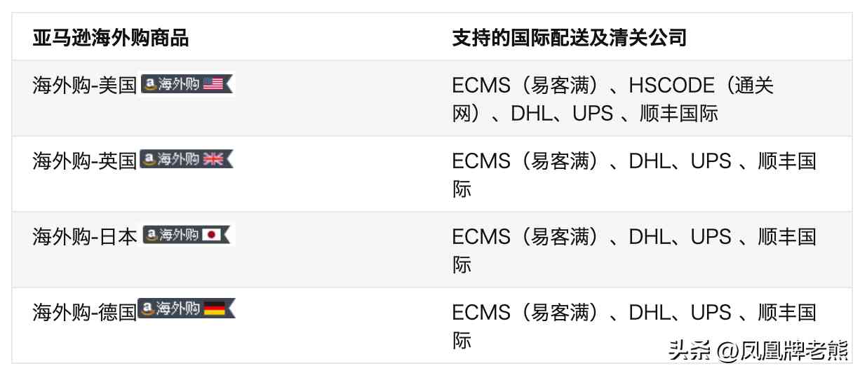 直接由国外发货, 比如购买的美国的奶粉,主要是从美国直接发货。香港保税仓发货。亚马逊和DHL、UPS、ECMS(易客满)、HSCODE(通关网)、顺丰国际这五家物流公司合作,负责海外购产品运输。这些公司都获取了国家邮政局颁发的《快递业务经营许可证》。具体使用的物流公司, 由发货站点来决定。比如在美国站,ECMS用的多。 物流企业同时承担通过亚马逊采购物品的海关清关工作。