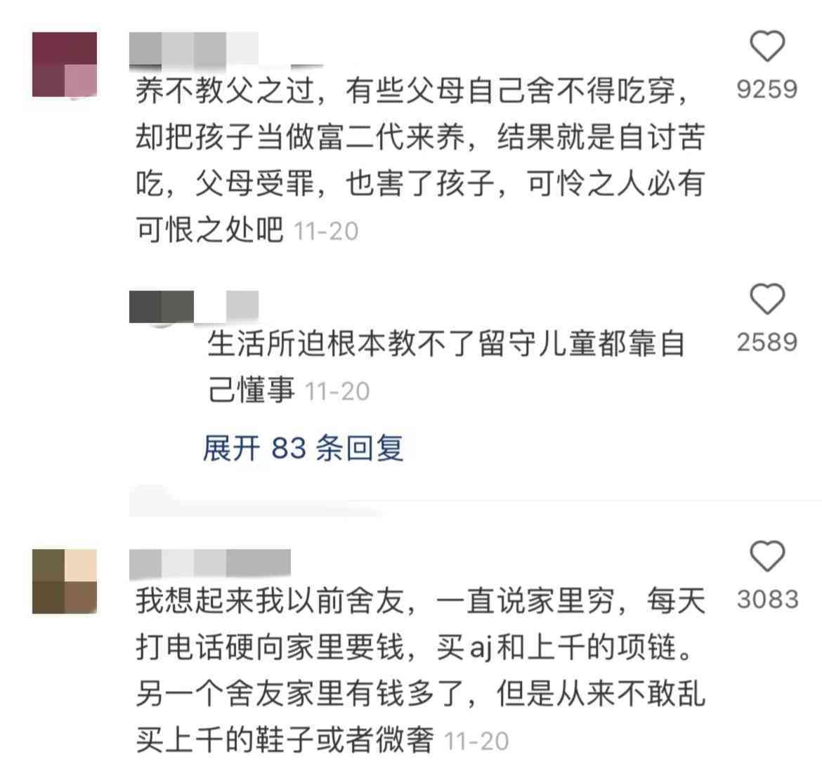 “养不教父之过,有些父母自己舍不得吃穿,却把孩子当做富二代来养,结果就是自讨苦吃,父母受罪,也害了孩子,可怜之人必有可恨之处吧”