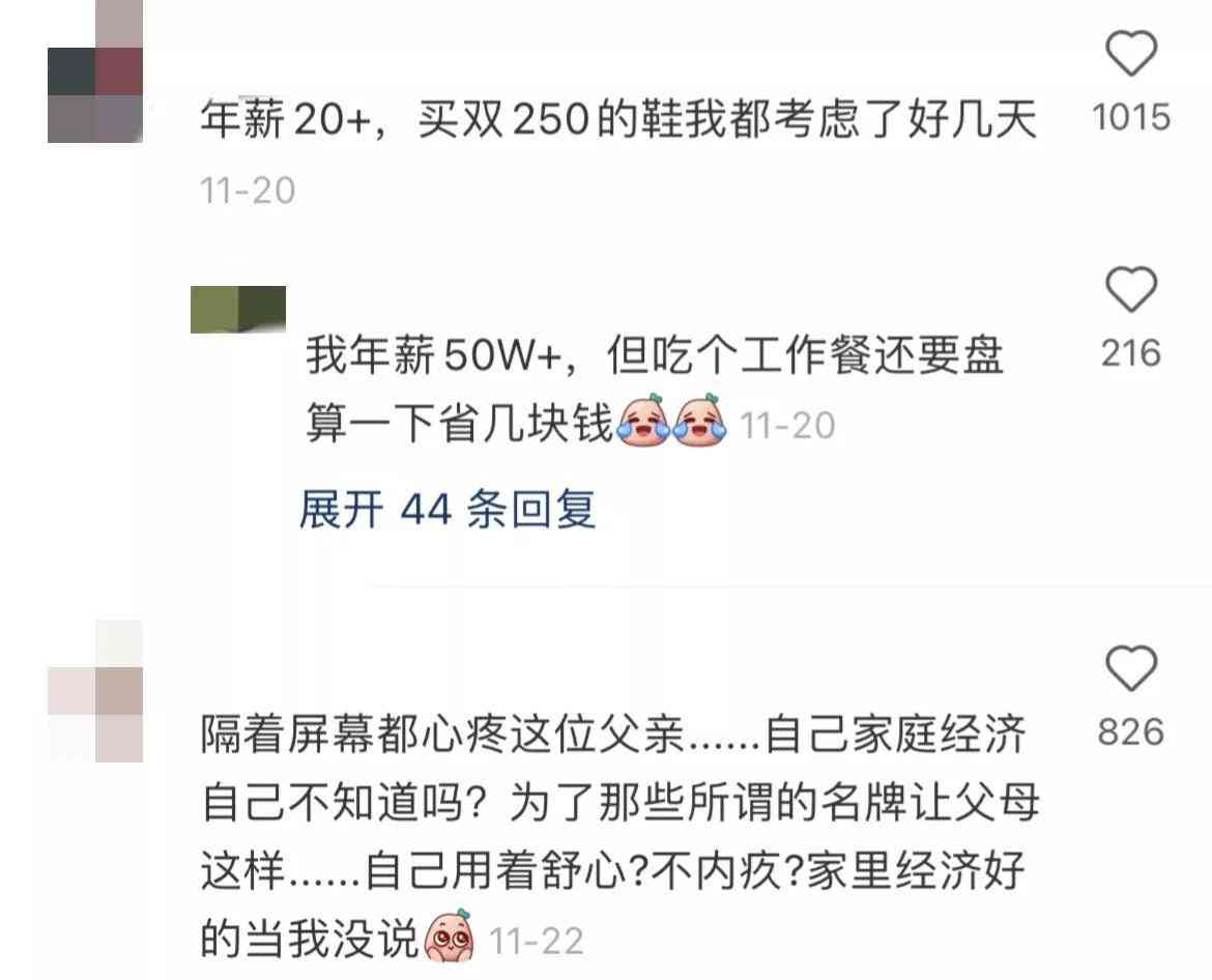 “隔着屏幕都心疼这位父亲……自己家庭经济自己不知道吗?为了那些所谓的名牌让父母这样……自己用着舒心?不内疚?家里经济好的当我没说”