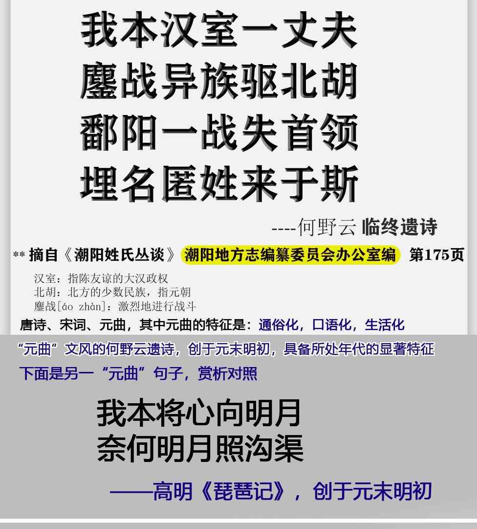 作为对照,同时代的经典名句:“我本将心向明月,奈何明月照沟渠。”,出自于元曲《琵琶记》,也是创作于元末明初。这首曲用了“我本”作为这句曲的开头,而何野云的遗诗也是用“我本”开头。可见他们有同时代的相似风格。