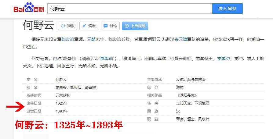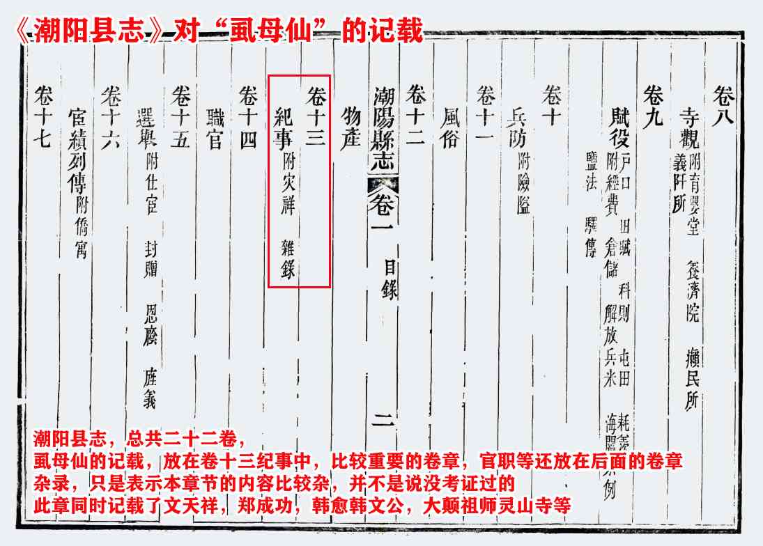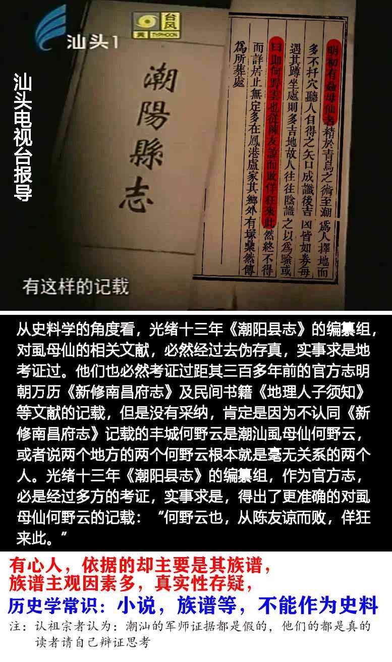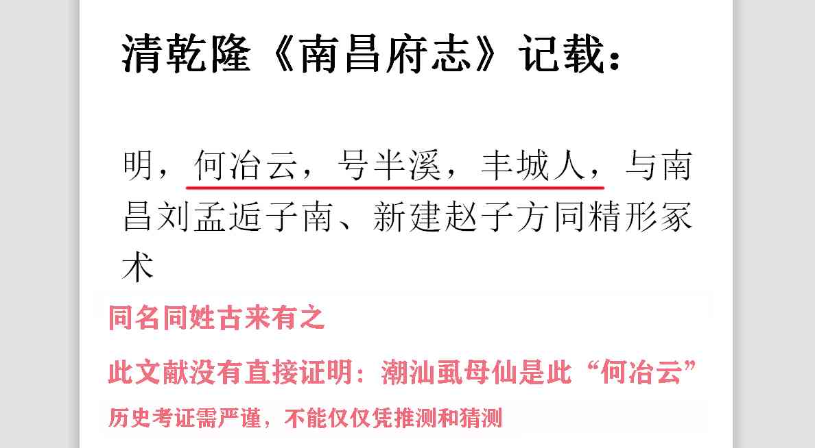 还有他们例举了清乾隆《南昌府志》记载:“明,何冶云,号半溪,丰城人,与南昌刘孟逅子南、新建赵子方同精形冢术”,这里同样,没有记载潮汕虱母仙何野云是丰城何野云,只是记载明朝有个“何冶云”是丰城人。他们认为“何冶云”跟“何野云”同音,应该是“野”被错写成“冶”字了。“何冶云和“何野云””到底是不是同一个人,我们不得而知。