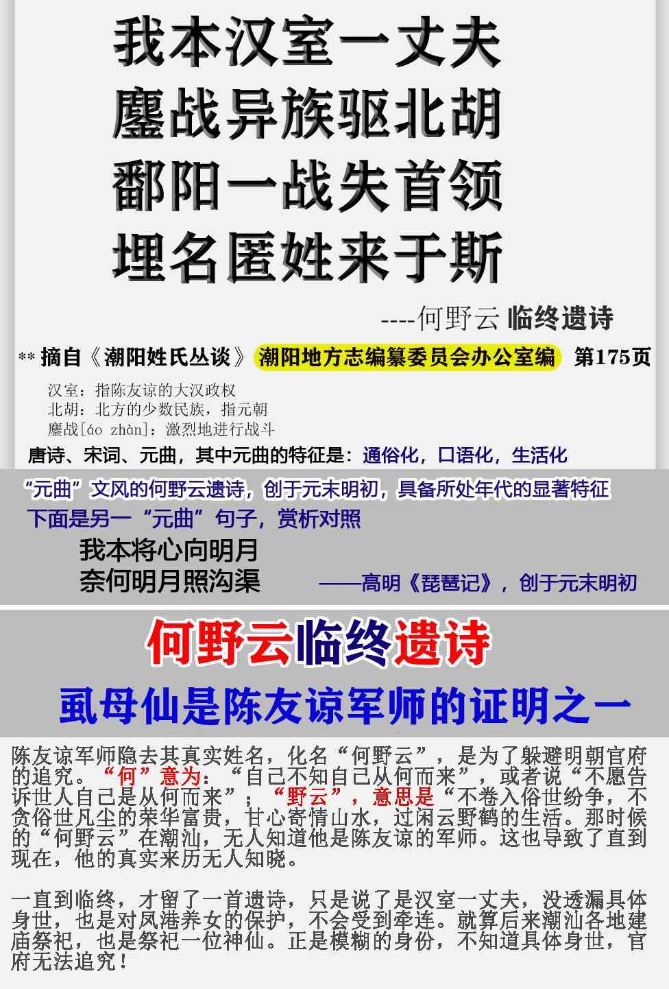 这首遗诗,何野云自称汉室一丈夫,而汉室就是陈友谅的大汉政权。鄱阳湖一战失去首领陈友谅后,隐姓埋名来到这里。我们可以明确地知道,何野云就是来自陈友谅的部属。