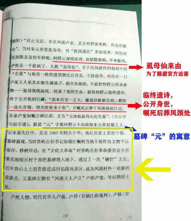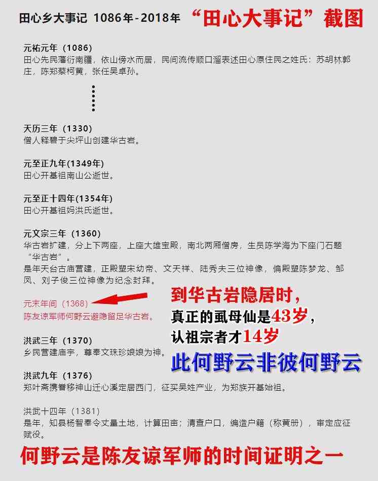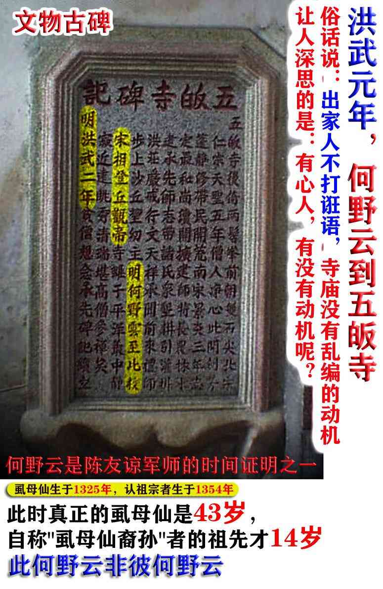 而最近出现的认祖宗的人(生于1354年),洪武元年,1368年,认祖宗者才14岁。明朝刚建立的时候,认祖宗者还是个未成年的儿童。主家会请未成年的儿童做风水师建祠堂或寨门吗??这说明:虱母仙与认祖宗者是不同的两个人,此何野云非彼何野云。