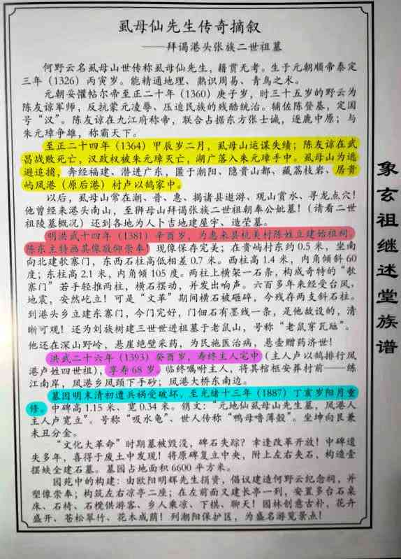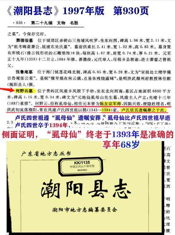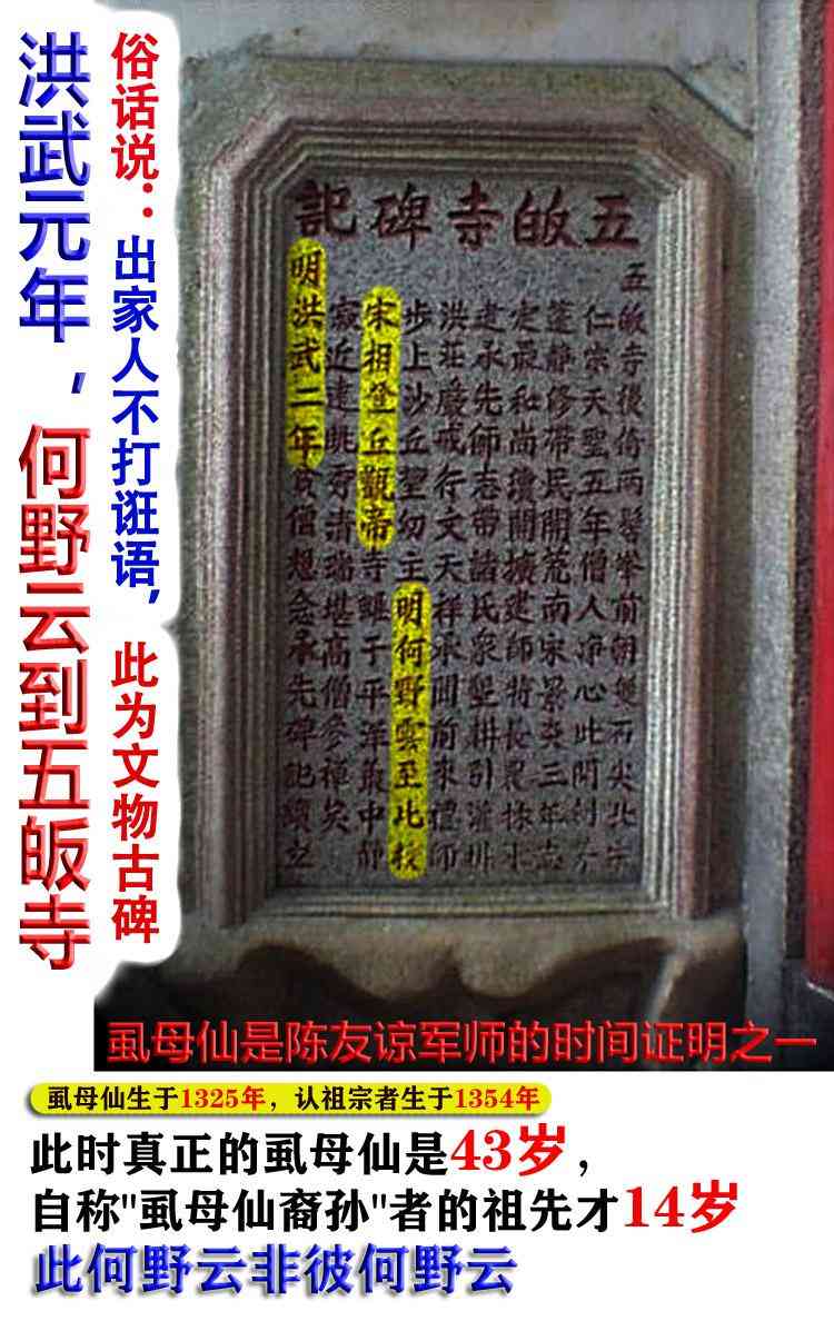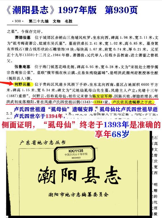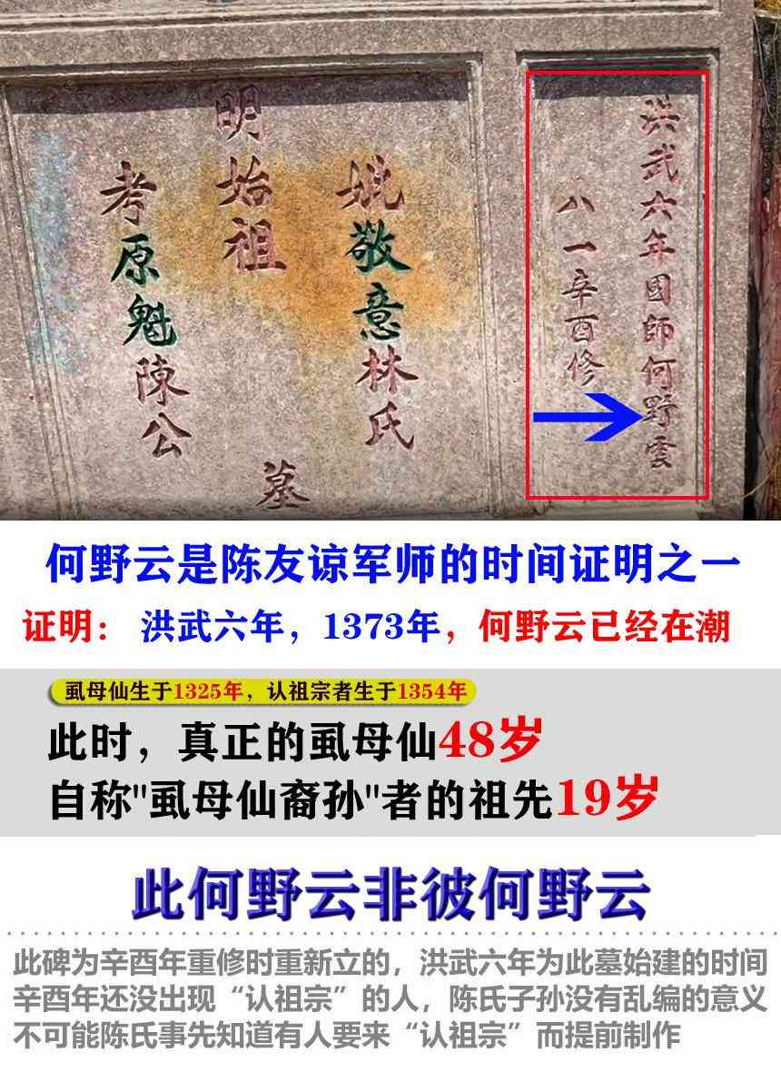 而虱母仙帮潮阳陈氏始祖建墓在 洪武6年(1373),有碑碣为证:“洪武六年国师何野云”,虱母仙此时应该是48岁左右。虱母仙此时应该是51岁,而认祖宗的人,此时19岁。