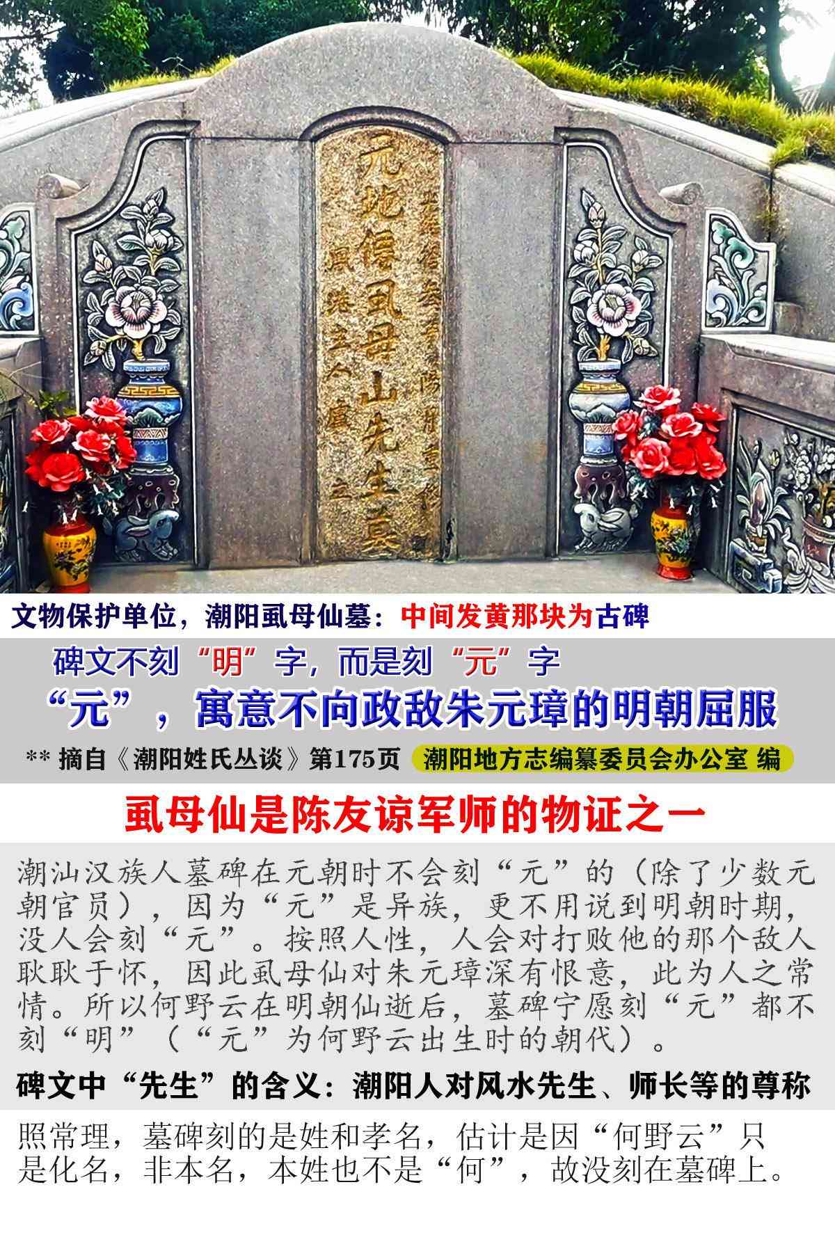 “虱母仙”何野云是陈友谅军师,得到史书官方志《潮阳县志》、《潮阳姓氏丛谈》、《潮阳市志》,和《凤港卢氏族谱》、港头《张氏族谱》等,还有自古以来无数的民间传言,并且何僊陵重修碑记也是如此记载。而且何野云早期到潮阳的时间明朝洪武元年,在五皈寺和华古岩都有记载。
