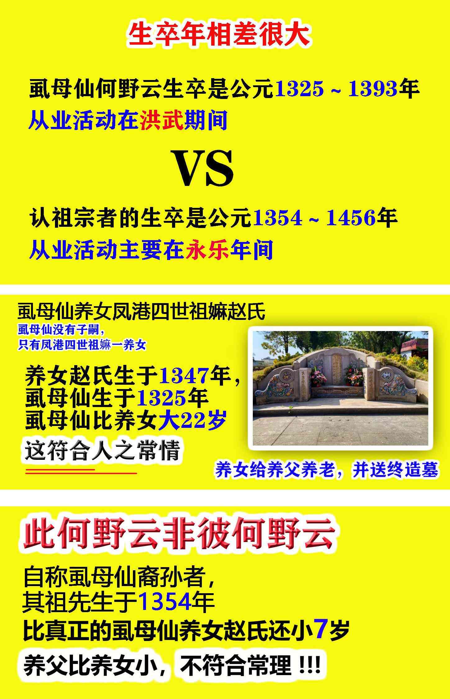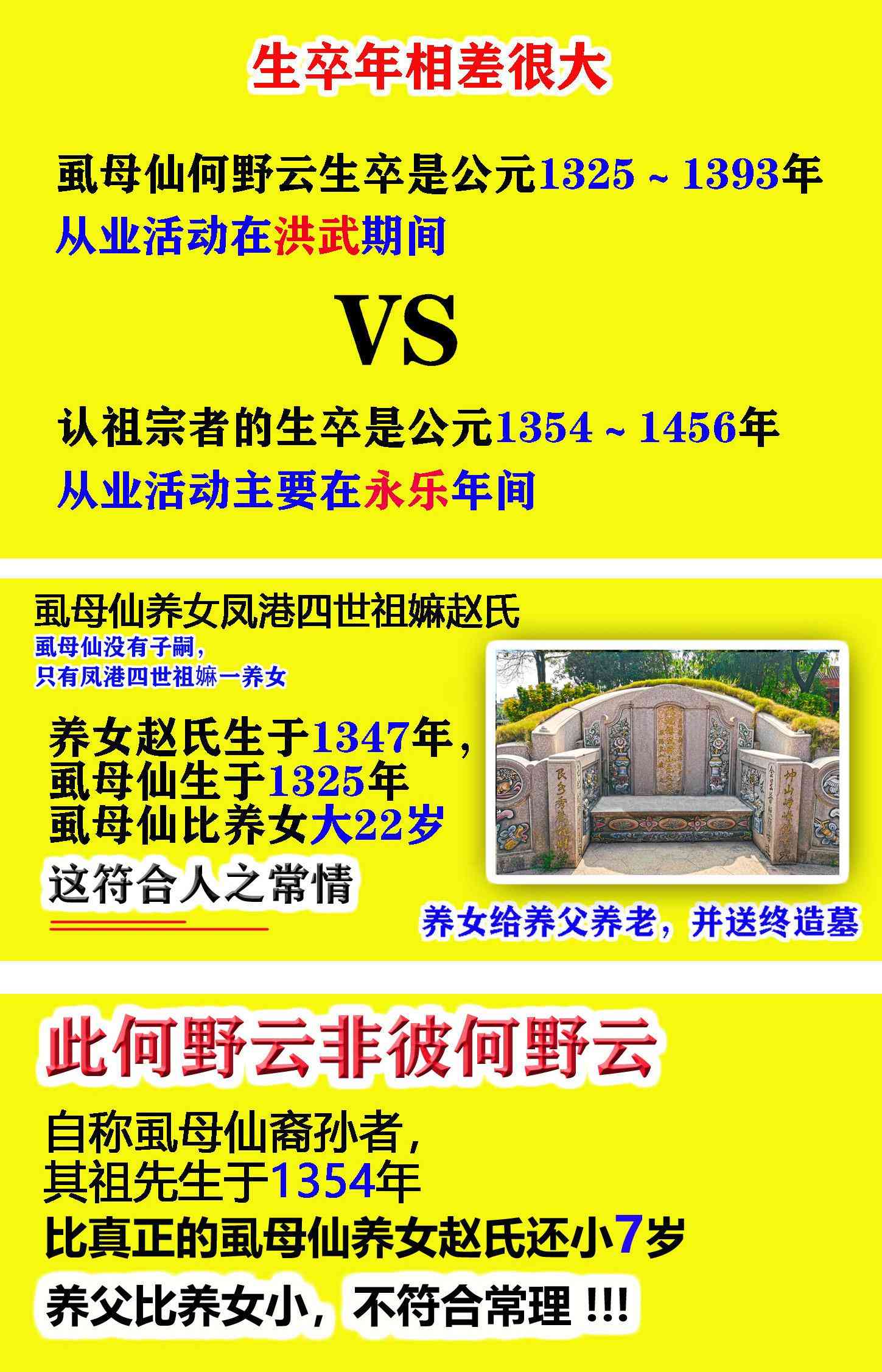 众所周知,虱母仙没有子嗣,只有一养女,即凤港四世祖嫲赵氏,养女给养父养老,并送终造墓,这是符合人之常情的。虱母仙的养女赵氏生于1347年,养女比虱母仙小22岁。这符合人之常理。但是认祖宗者却比养女赵氏还小7岁,这不合常理,养父不可能比养女小。这说明:虱母仙与认祖宗者是不同的两个人,此何野云非彼何野云。