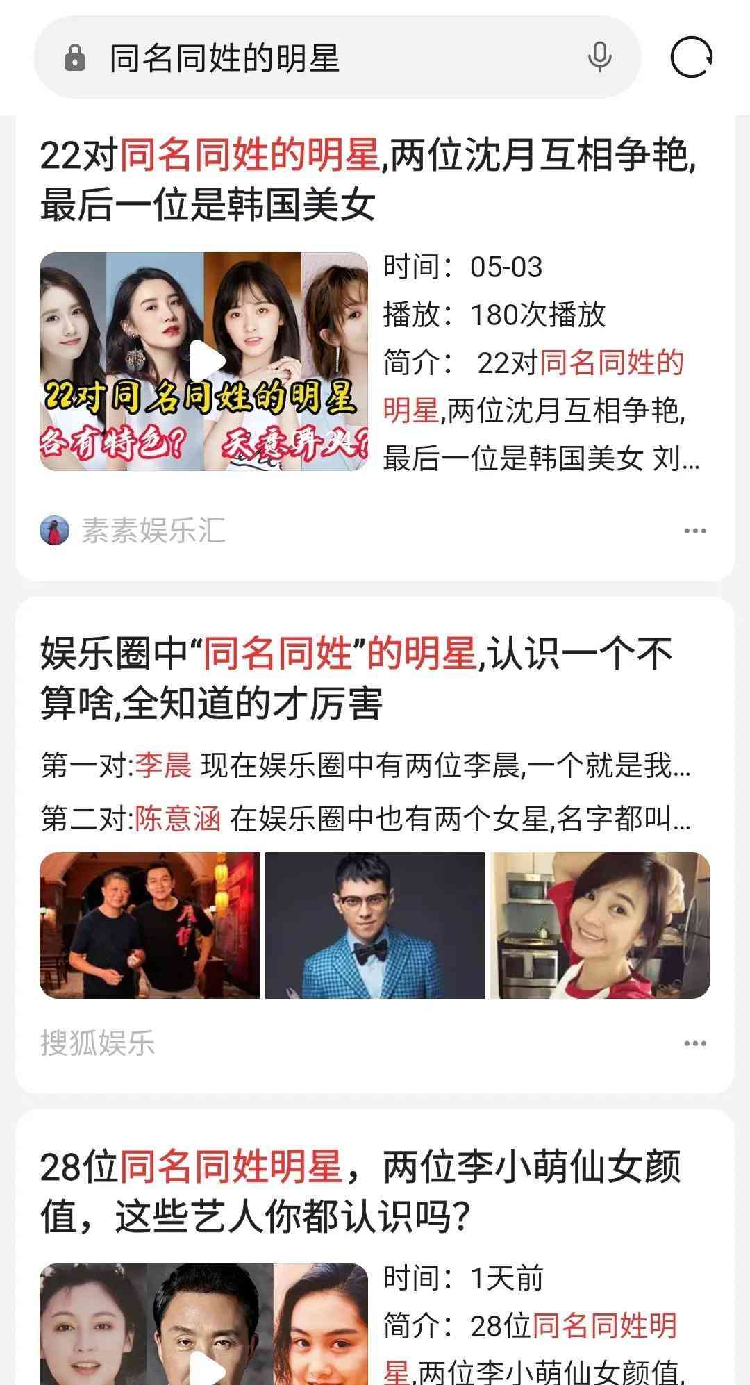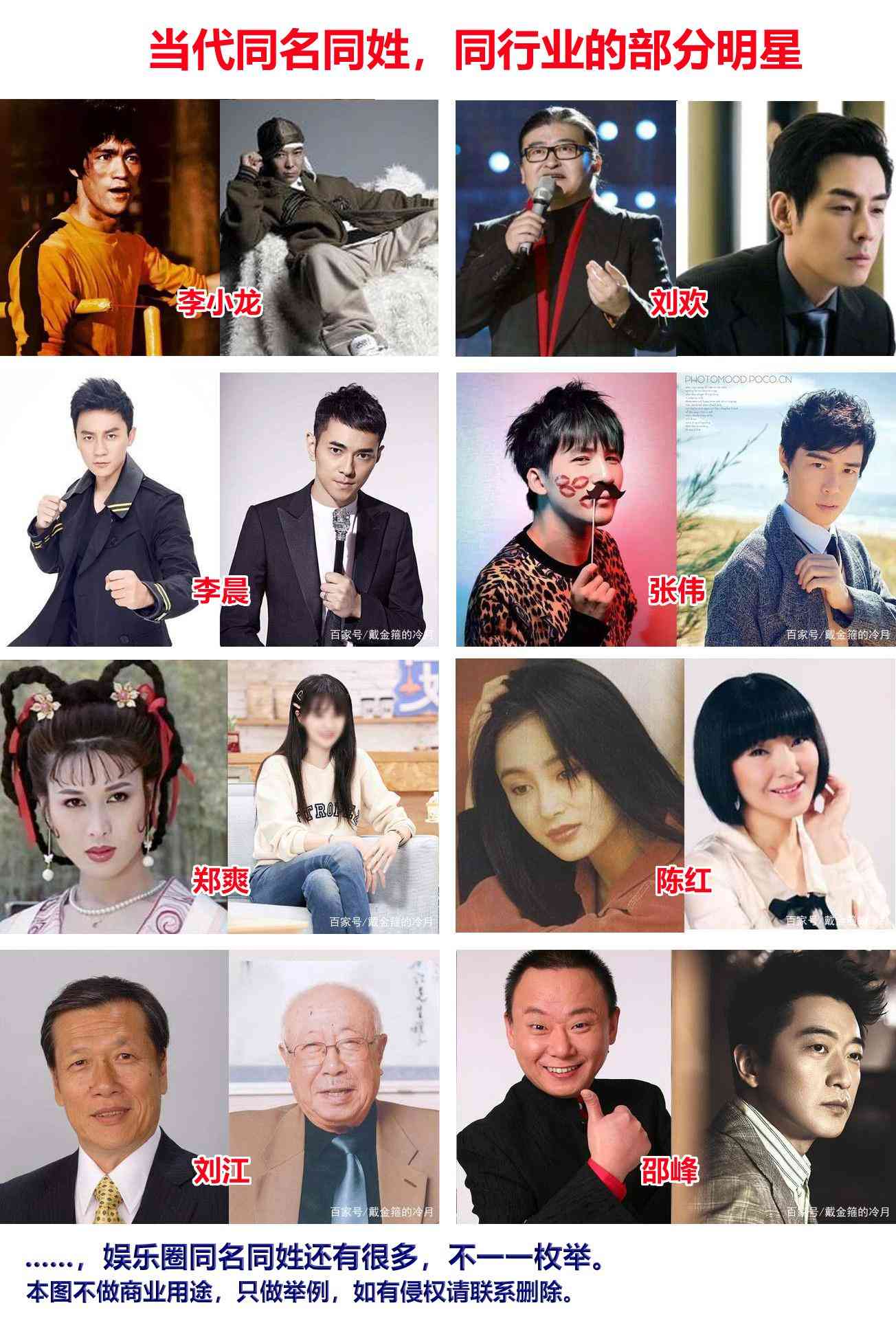同一个时代,同一个行业,会有不少同名同姓的人,下图例举小部分当代同名同姓的明星。网络搜索,会发现同行业同名同姓的很多。而如果时间范围扩展到不同时代,同名同姓的人会更多。