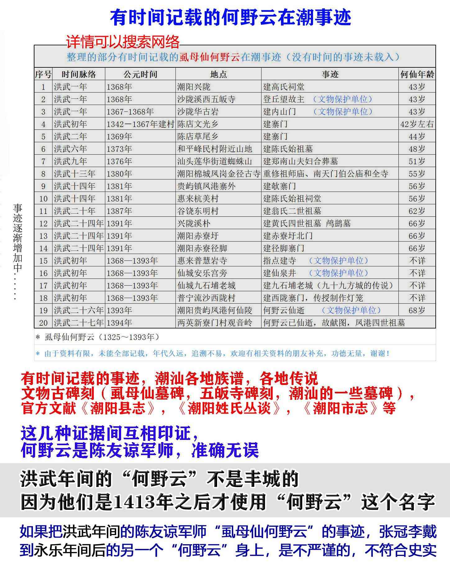 种种这些事迹,从时间上证明,明朝刚建立的时候,1368年,虱母仙已经在潮汕了,这个证明自古以来传言的何野云是陈友谅军师从时间上来看是吻合的。