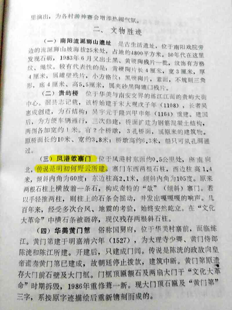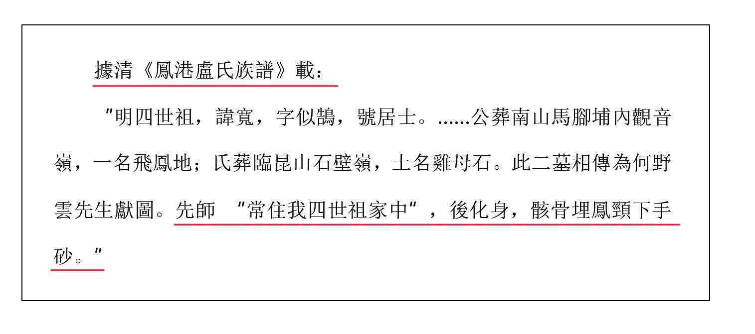 再有,据清《凤港卢氏族谱》载:“明四世祖,讳宽,字似鹄,号居士。宽公为凤港四世祖。生于元朝至正癸未,卒于明朝洪武廿七年甲戍,即公元(1343年一1394年),公葬南山马脚埔内观音岭(现两英镇新寮门村后,座坤向艮),一名飞凤地,此墓相传何讳野云先生献图。先师常住我四世祖家中,后化身,骸骨埋凤颈下手砂”。