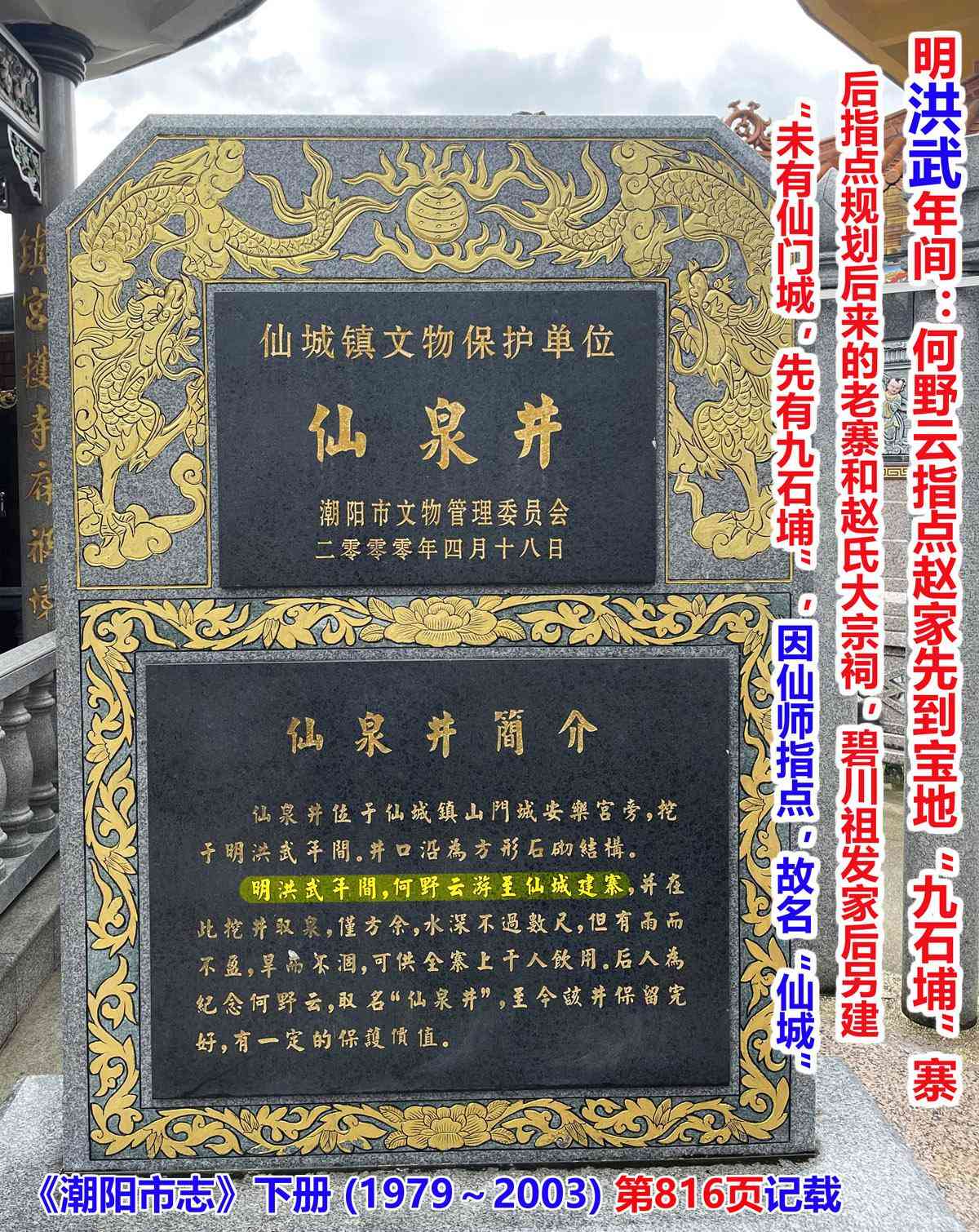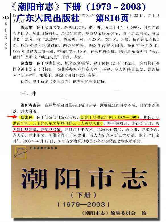 据官方志书,(1979~2003)版《潮阳县志》第816页记载:虱母仙在洪武年间为仙门城建寨,并掘地取泉,后人取名“仙泉井”,现为文物保护单位。