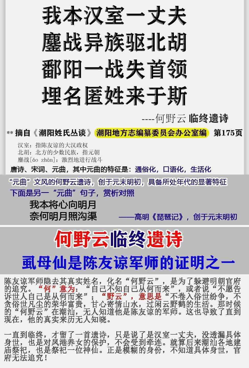 总结,如果把洪武年间的陈友谅军师“虱母仙何野云”的事迹,张冠李戴到另一个时代,另外一个“何野云”身上,是不严谨的,不符合史实!此何野云非彼何野云!