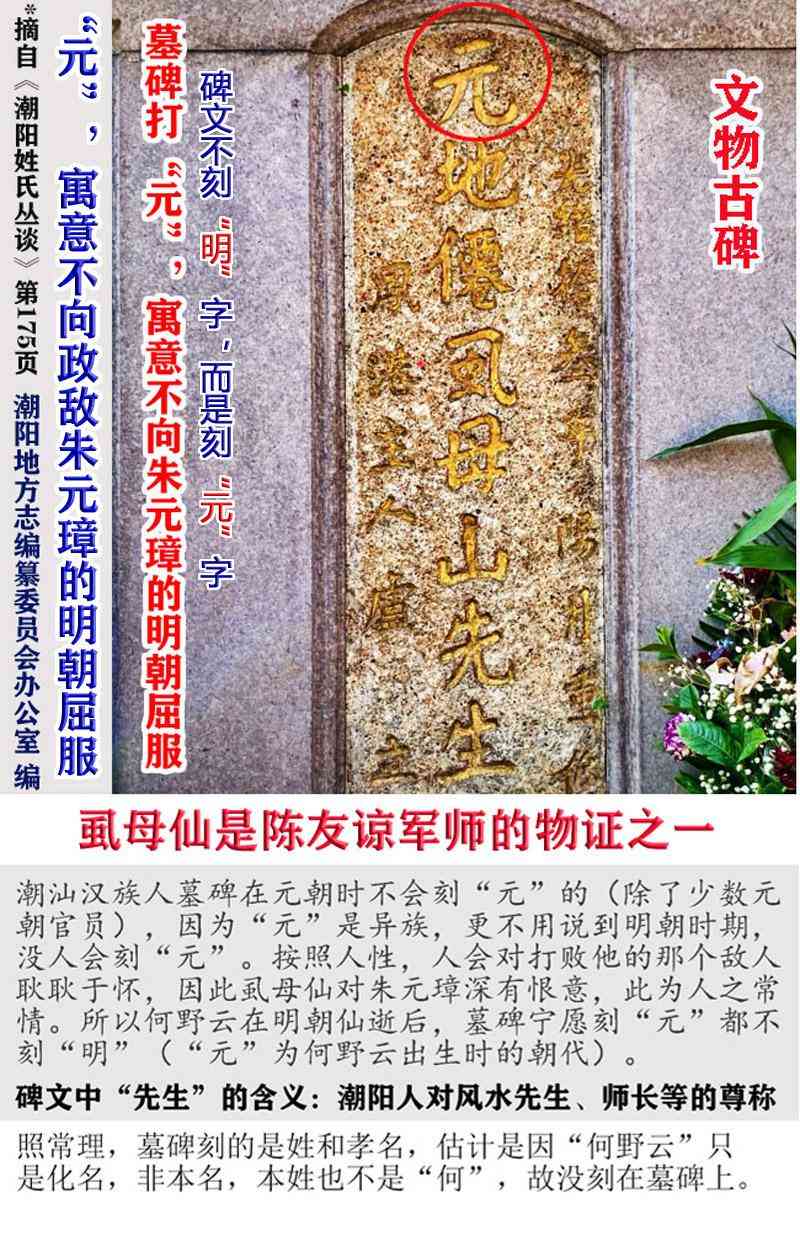 为什么墓碑上刻的是“元”朝呢?官方文献《潮阳姓氏丛谈》对此也有解释:“元”字,寓意何野云不向政敌朱元璋的明朝屈服之意。一般潮汕的墓碑,在元朝都不会打“元”的(除了少数一些元朝官员),因为“元”是外族,更不用说到了明朝时期。按照人性来分析,人会对打败他的那个人深恶痛绝。何野云对打败他们的朱元璋深有恨意,此为人之常情。墓碑宁愿打“元”朝而不打“明”朝,这是何野云一臣不事二主的再次体现。