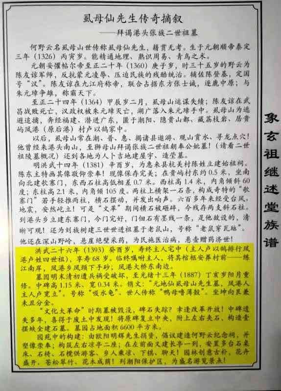 从上面的分析已知晓,洪武年间(1368-1393年)的何野云各种事迹,实际就是陈友谅军师化名的“何野云”的活动事迹。除了官方的文献有何野云在潮活动的记载,非官方的,如胪岗镇港头《张氏族谱》和一些书籍也有类似的记载,何野云曾经去拜谒参观港头二世祖墓。所以张氏族谱记载了何野云这个事迹,并且记载了何野云的生卒、生平简介,还有何野云墓。
