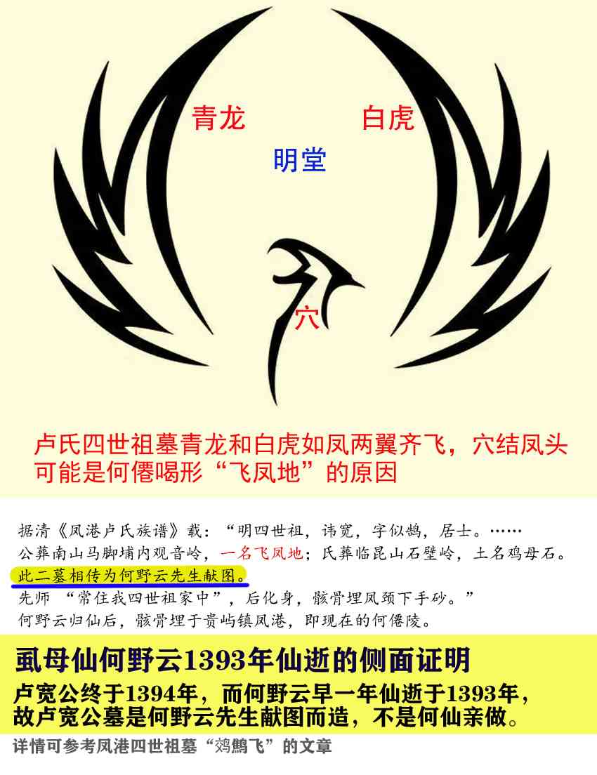 依据《凤港卢氏族谱》可知,卢宽公终于1394年,而何野云早一年仙逝于1393年(卢氏安葬何仙骸骨于凤港凤颈下手砂,即现在的何僊陵),而卢宽公墓是何野云先生献图而造,不是何仙亲做。由此可见,这个记载是实事求是的,符合常理。