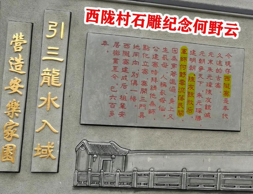 1369年,明洪武二年,何野云在陈店为指点草尾乡建寨门,此时何野云44岁。而认祖宗的人,此时15岁。