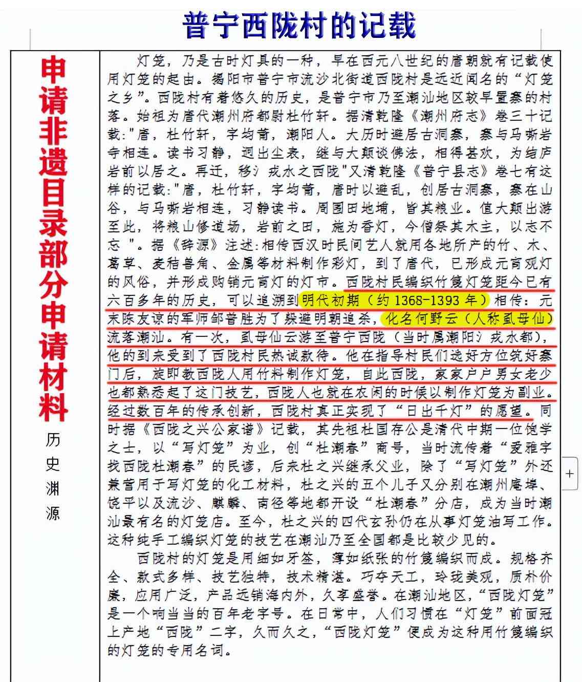 由西陇申请非遗的材料,我们可以知道,西陇村对虱母仙何野云的记载,时间也是明朝洪武初,即约1368-1393年间,陈友谅军师为了躲避明朝追杀,化名“何野云”,流落到此。作为一个历史悠久的古村落,西陇村对于虱母仙何野云的记载,必然是客观的的。这也证明了,《潮阳县志》和其他各村的族谱,对于陈友谅军师何野云的记载,是一致的。
