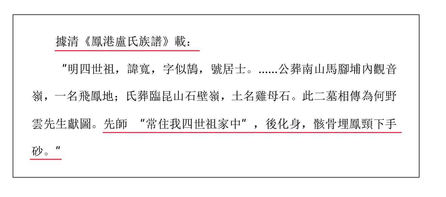 据清《凤港卢氏族谱》载:“明四世祖,讳宽,字似鹄,号居士。宽公为凤港四世祖。生于元朝至正癸未,卒于明朝洪武廿七年甲戍,即公元(1343年一1394年),公葬南山马脚埔内观音岭(现两英镇新寮门村后,座坤向艮),一名飞凤地,此墓相传何讳野云先生献图。”。依据《凤港卢氏族谱》可知,卢宽公终于1394年,而何野云早一年仙逝于1393年(卢氏安葬何仙骸骨于凤港凤颈下手砂,即现在的何僊陵),而卢宽公墓是何野云先生献图而造,不是何仙亲做。