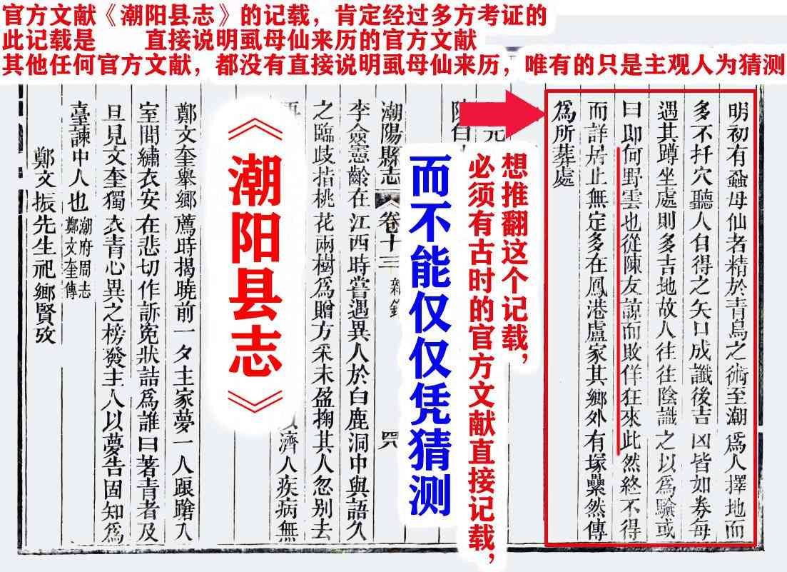 《潮阳县志》的记载,必定经过论证和考证,而且是中立的考证,客观可信,是官方的。“有心人”的推测,推论,和猜测,并不是中立的原则下做的考证,是有目的性的,选择性的,是不公正的考证。“有心人”用非中立的,有目的性的,臆断的,选择性的考证,企图推翻中立的官方考证“潮阳县志”的记载,合理性有多少?