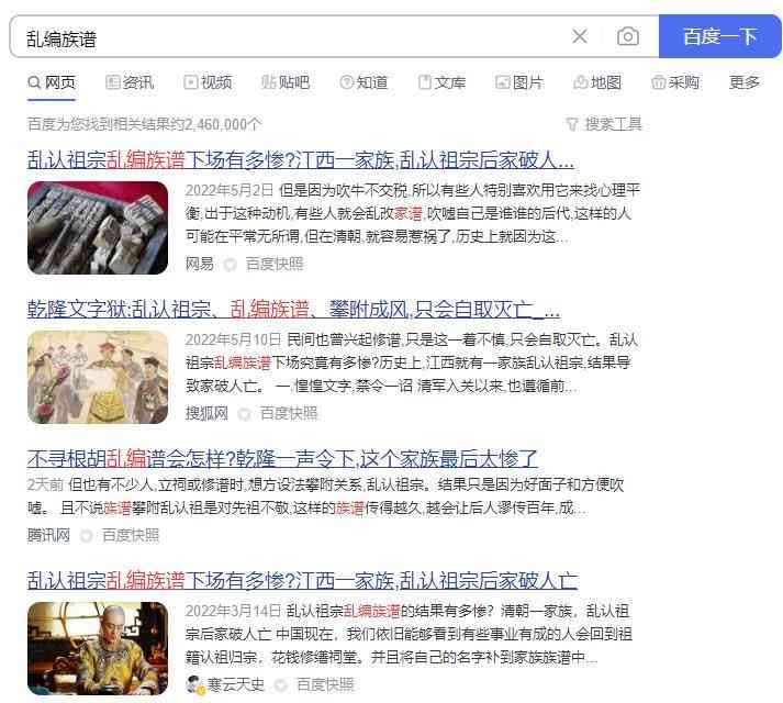 网络上关于“乱认祖宗,乱编族谱”的文章很多,古来有之,有些人攀附成风,有些家谱更是肆意认祖,甚至按照推演,这种攀附风气受到了乾隆的高度关注,严令整顿家谱编纂的号令便就此铺设下去,要求各地督抚严查家谱中的僭越情况,更就此限制了各地普遍进行的修谱情况。上谕下来,纠察行动轰轰烈烈。