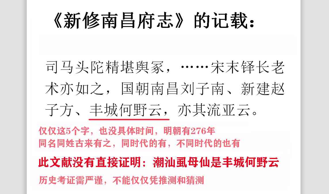 有的人例举了《新修南昌府志》的记载:“司马头陀精堪舆冢,……宋末铎长老术亦如之,国朝南昌刘子南、新建赵子方、丰城何野云,亦其流亚云。”这里出现了“丰城何野云”这五个字,只能证明历史上丰城有何野云这个人,但是这个府志并没有说潮汕虱母仙何野云是丰城何野云。