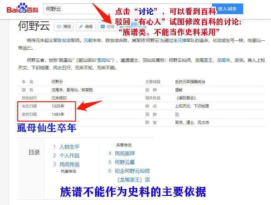 百科截图:族谱不能作为史料的主要依据