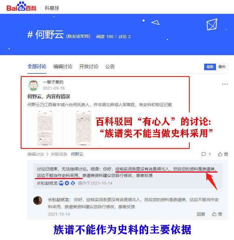 从百科中,亦可发现,“有心人”试图修改百科的记载,被百科驳回了,原因是:“资料是族谱类,不能当作史料采用”。而“有心人”,大部分依据正是其族谱的记载,是非官方的记载。我们从百科的驳回,可以知晓,族谱没有公信度,真实性存疑,不能作为史料的主要依据。