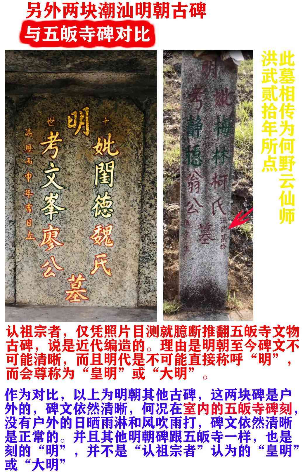 “有心人”用一些非官方的文献(例如:未经考证真伪的家谱),编辑一些无官方历史记载的故事,而且也没有古文物证明,妄图推翻《潮阳县志》的记载,妄图推翻有古碑留存的何僊陵是虱母仙所葬地的事实,妄图推翻潮汕各地许多家族族谱的记载,妄图推翻潮汕各地自古以来的传说,妄图颠覆潮汕人民自古以来对何野云是陈友谅军师的真实认知,是扭曲历史,而且是对仙师何野云的极大不公,亵渎仙师真实身份,是不可能成功的。