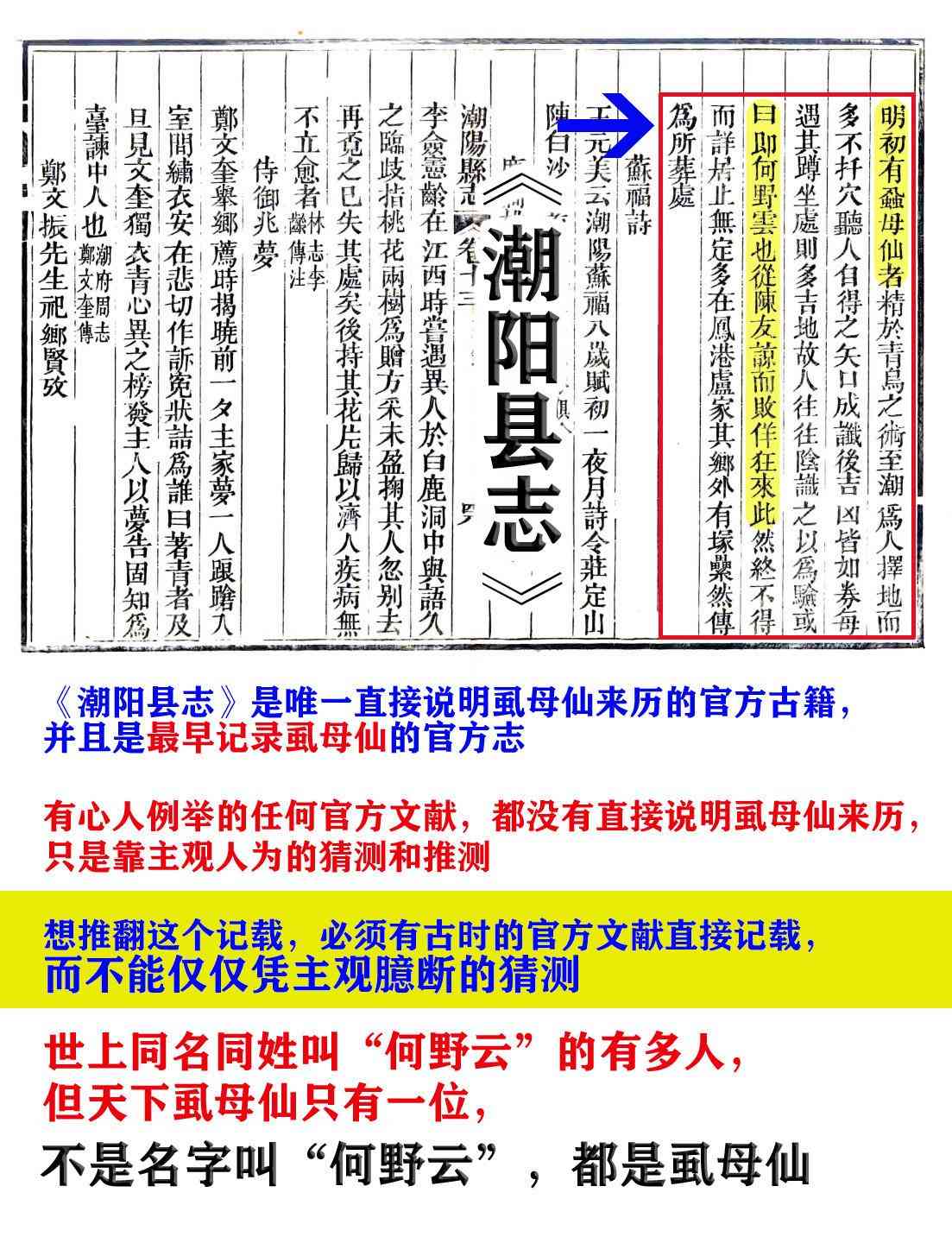 官方志书《潮汕县志》是直接记载虱母仙从陈友谅而败,佯狂来此,直接证明虱母仙的来历。而“有心人”例举的其他各种官方志,都没有能直接证明虱母仙来历的,他们仅仅凭的是牵强附会的推测和猜测,这是不严谨的,不可信的。可以肯定的是,不同的两个人,此何野云非彼何野云!