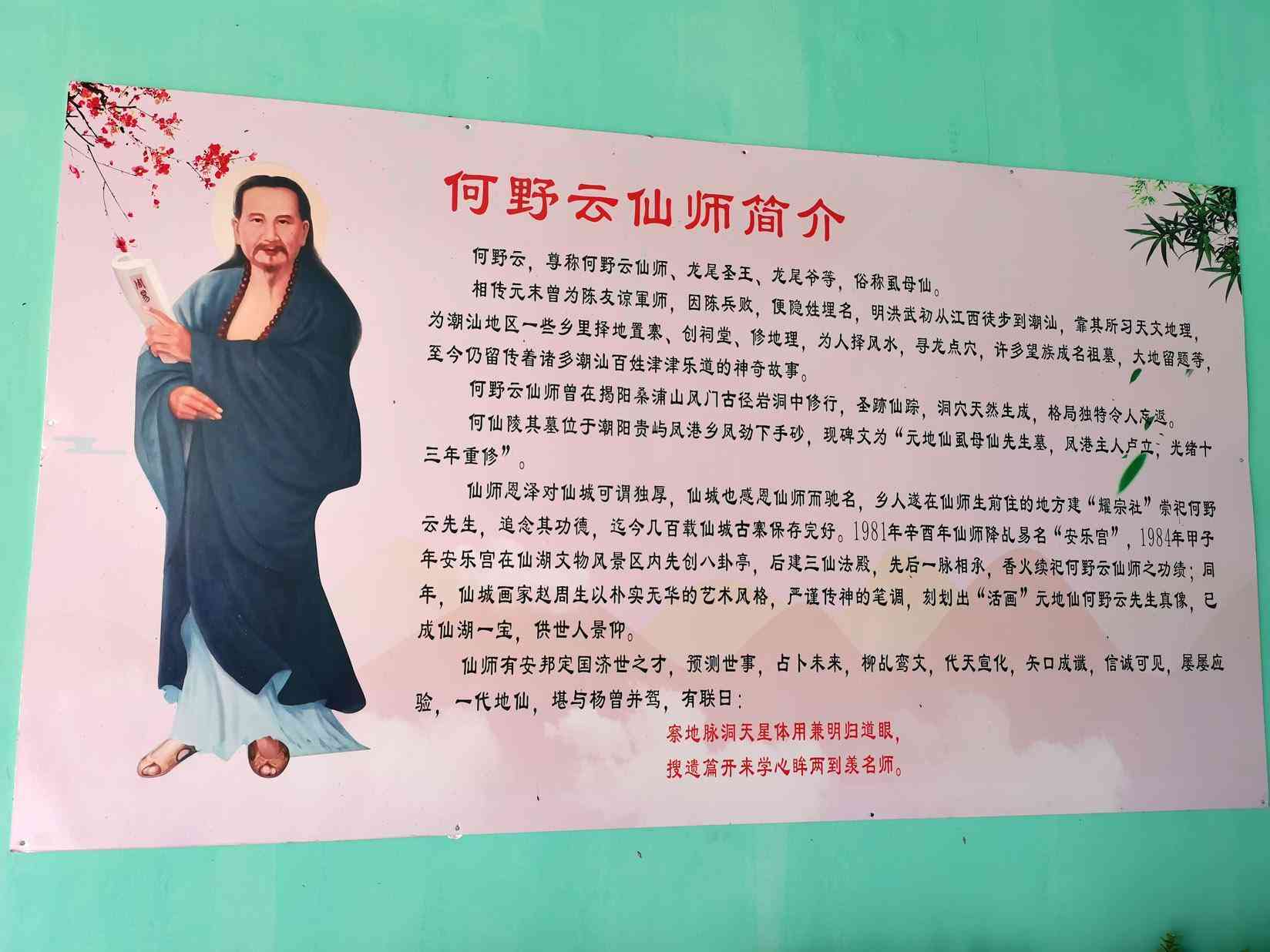 此诗是一首藏头诗,每一行个字连起来,即“何野云留”,表明是何野云留的诗句,亦表明仙师在潮汕地区的作品,是留给潮汕地区的一笔文化遗产财富。第二句“野鹤孤飞年又年”,表明何野云自从陈友谅兵败后,多年孤身一人的落寞心情。第三句的“牛眠地”,比喻风水宝地,何僊帮潮汕各村各寨做的各项工程建筑,都是其高超技艺的结晶。最后一句,表明何僊与潮汕人民的缘分,暗含劝世人为善结善缘。