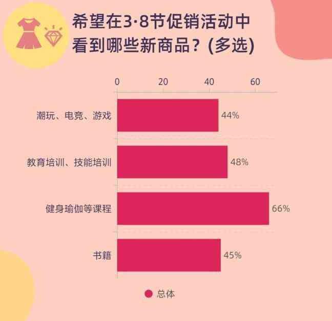 对于“希望在3·8节促销活动中看到哪些新商品(多选)”,整体来看,65.7%的受访者选择了健身瑜伽类课程,教育培训、潮玩游戏、书籍的选择情况均在45%左右。