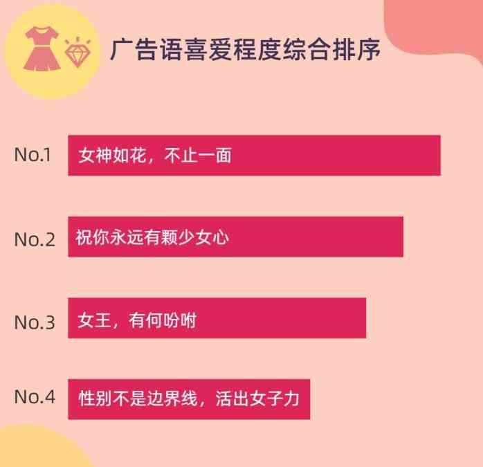除此之外,我们还从女王、少女、女神、女子力四类主题中探寻了哪类广告文案最得“女”心。其中,“女神如花,不止一面”综合排名,“祝你永远有颗少女心”紧随其后,“女王,有何吩咐”排在第三,“性别不是边界线,活出女子力”稍显逊色,排名第四位。